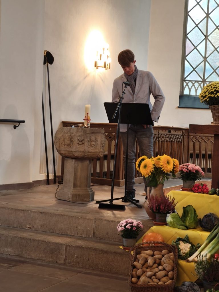 Mitglieder des Kirchenvorstandes lasen kleine Parabeln, Gedichte und Geschichten. Die „Reise nach Oletzko“ aus den Masurischen Geschichten von Siegfried Lenz sorgte für hörbares Schmunzeln, ebenso die Erinnerungen von Amei Müller, die als Frau eines Pfarrers dessen ersten Gottesdienst in der neuen Gemeinde Revue passieren ließ – dieser Text wurde von Annemete Hein sehr anschaulich vorgetragen. Psalmen von Hans Dieter Hüsch, gelesen von Pastorin Hilkemeier, sorgten für einen nachdenklichen Moment. Friedrich Ströhmer, Student der Kirchenmusik und derzeitiger Leiter des Philharmonischen Chores, beschloss mit der eindrucksvollen „Vision“ für Orgel von J.G.Rheinberger das abwechslungsreiche Konzert.